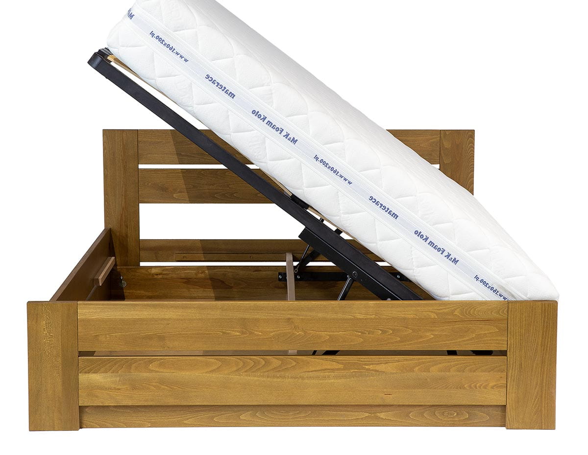 Niezwykle funkcjonalne łóżko bukowe LK198 B BOX z pojemnikiem na pościel, wykonane z najwyższej jakości drewna. Zaprojektowane w minimalistycznym stylu, dzięki czemu prezentuje się wyjątkowo stylowo i elegancko. Stelaż został umieszczony na metalowej ramie, zamontowanej na podnośnikach gazowych, co zapewnia łatwy dostęp do pojemnika na pościel, umieszczonego pod łóżkiem. Dodatkowym atutem łóżka LK198 B BOX jest możliwość otwierania bocznego ramy oraz uniwersalność montażu siłowników (z prawej lub z lewej strony), co czyni je jeszcze bardziej funkcjonalnym. Dzięki takiemu rozwiązaniu łóżko idealnie sprawdzi się w pomieszczeniach o ograniczonej przestrzeni. Łóżko z pojemnikiem na pościel LK198 B BOX to doskonałe rozwiązanie dla osób, które chcą maksymalnie wykorzystać i zorganizować przestrzeń w swoim domu, a jednocześnie nie chcą rezygnować z komfortu i wygody spania.
