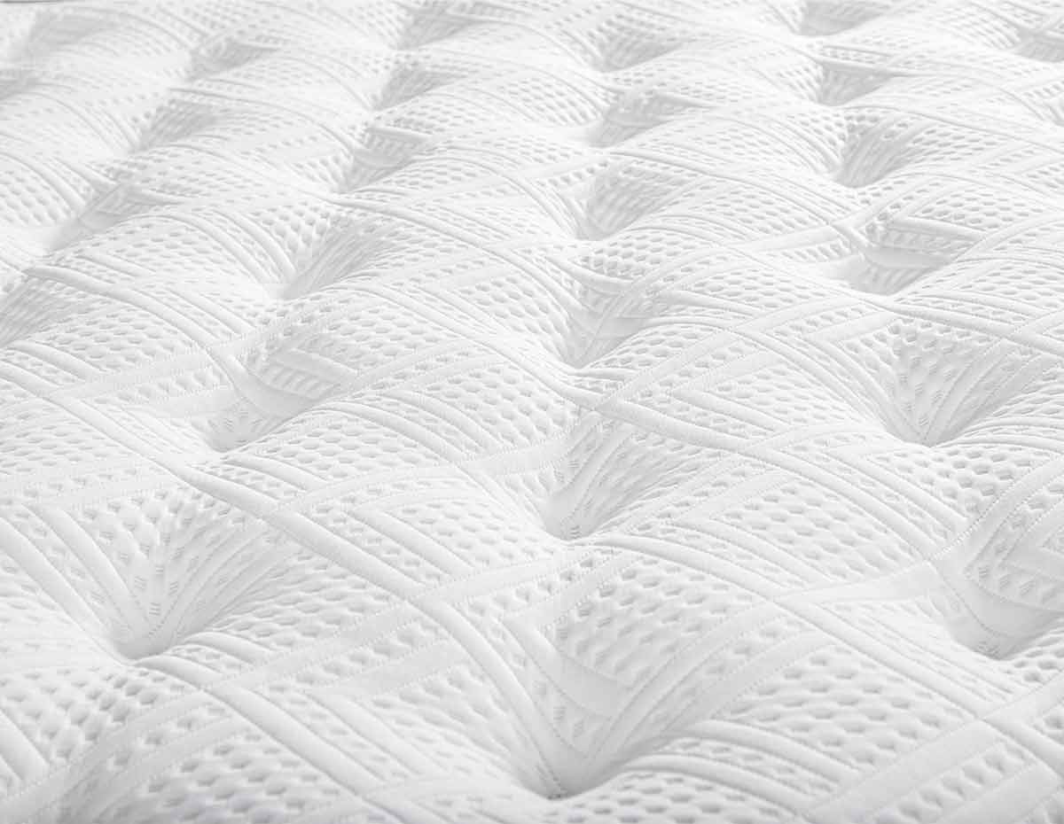 Pokrowiec Glamour to harmonijne połączenie luksusu i funkcjonalności. Gruba warstwa PillowTOP łączy lateks z miękką warstwą włókniny, zapewniając dodatkowy komfort. Boki materaca zostały starannie obszyte miękkim welurem w eleganckim odcieniu szarości z delikatnie zdobioną, prążkowaną lamówką. Górna warstwa, wykonana z grubej, pięknie tłoczonej tkaniny o śnieżnobiałym kolorze, wyróżnia się nie tylko estetyką, ale również wysoką oddychalnością. Reguluje temperaturę, zapewniając lepszą wentylację i dba o utrzymanie wysokiej higieny snu. Spód materaca został wyłożony innowacyjnym materiałem 3D, który pozwala na swobodny przepływ powietrza wewnątrz konstrukcji.