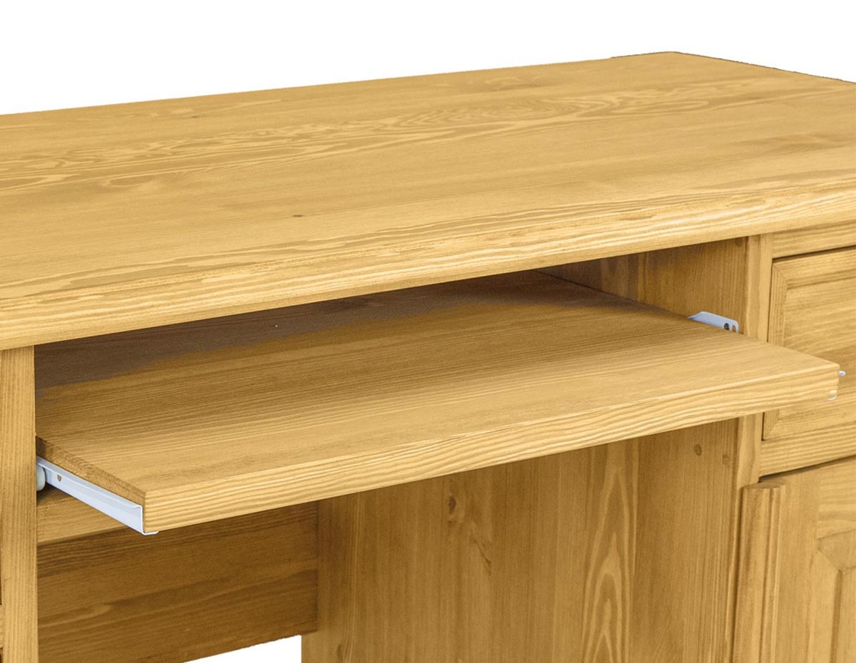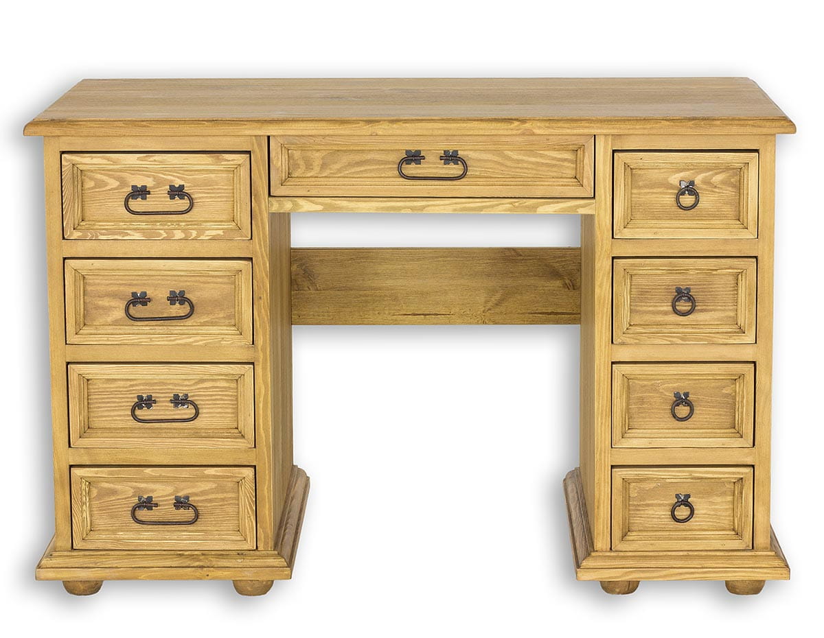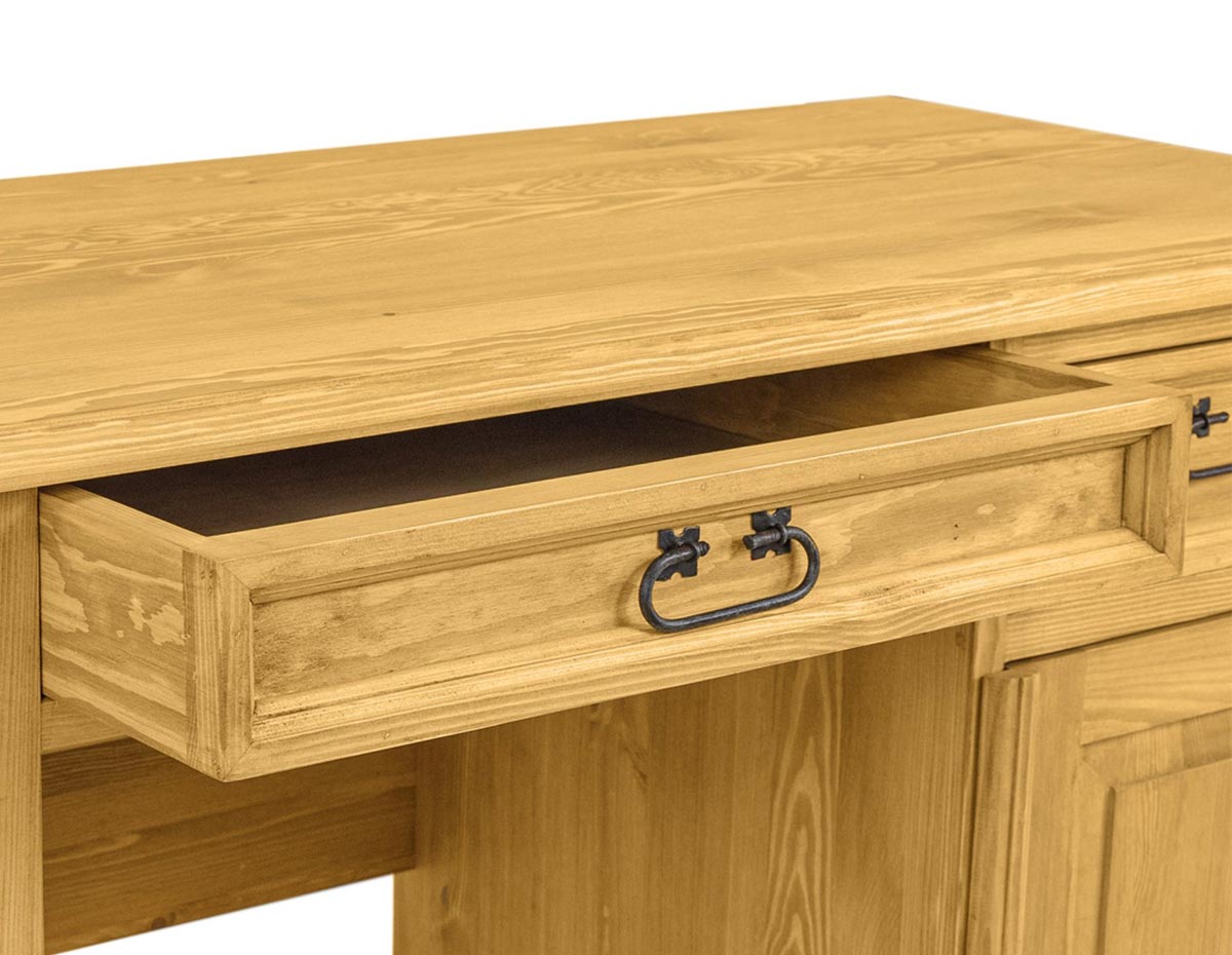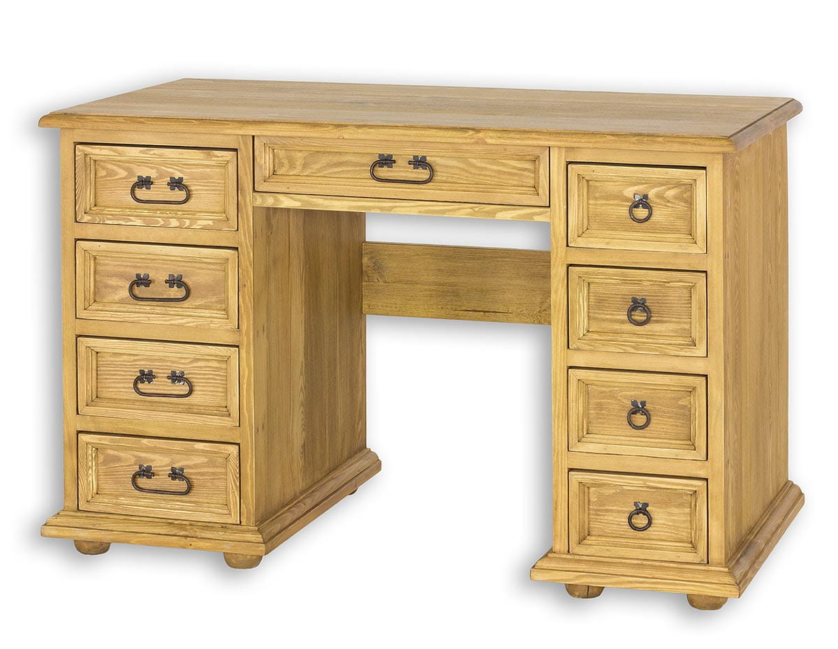 Woskowane biurko BR703 to mebel idealnie skrojony do domowego biura. Zaprojektowany w stylu rustykalnym, wykonany w całości z litego drewna sosnowego. Po lewej stronie znajduje się kolumna czterech szuflad. Po prawej stronie zaś szafka z półką w środku oraz szuflada lub półka na klawiaturę. Biurko posiada trwałą i solidną konstrukcję. Wyposażone zostało w obszerny blat roboczy. Do produkcji zostały wykorzystane ręcznie wykonywane metalowe zawiasy i uchwyty z efektem postarzenia. Biurko BR703 stworzy w Twoim gabinecie ciepły, niepowtarzalny klimat, który pozytywnie wpłynie nie tylko na samopoczucie, ale również na jakość wykonywanej pracy.