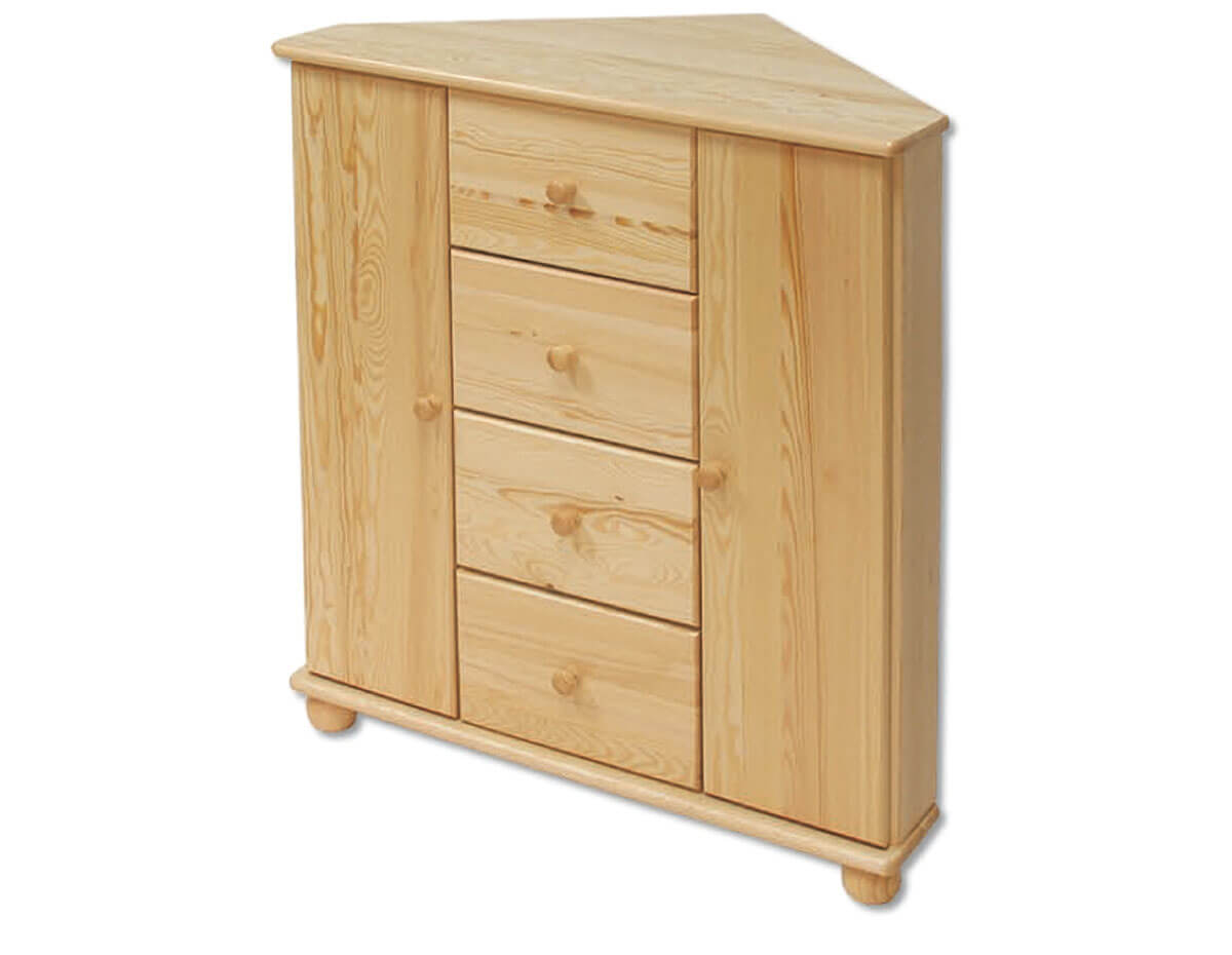 Rogowa komoda KD134 pozwala na zagospodarowanie każdej, nawet najmniejszej przestrzeni w Twoim domu. Komoda KD134 rozkocha w sobie miłośników klasycznych i ponadczasowych wnętrz. Jej minimalistyczny design sprawia, że wpasuje się w niemal każdą aranżację wnętrz. Wyraźnie widoczne usłojenie naturalnego drewna, z którego powstała dodaje jej uroku oraz ociepla pomieszczenie, w którym zostanie wyeksponowana. Dzięki komodzie KD134 stworzysz piękne, niezwykle przytulne ale i funkcjonalne wnętrze. Wyposażona w lekko otwierane i pojemne szuflady oraz praktyczne szafki, które pomieszczą domowe przedmioty. Duży blat mebla posłuży do eksponowania rodzinnych pamiątek lub zdjęć.