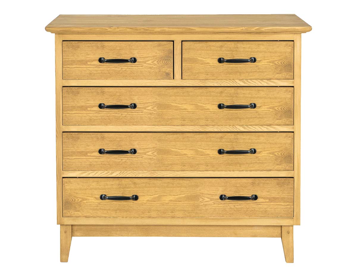 Komoda woskowana KD715 zaprojektowana w stylu rustykalnym, wykonana w całości z litego drewna sosnowego. Posiada dwie szufladki bezpośrednio pod blatem oraz poniżej trzy większe i pojemne szuflady. Doskonale sprawdzi się w salonie, sypialni, czy garderobie jako bieliźniarka. Nada każdemu wnętrzu niepowtarzalny klimat, pełen ciepła i rodzinnej atmosfery. Dzięki jej funkcjonalności przechowywanie stanie się o wiele prostsze. Komoda posiada trwałą i solidną konstrukcję. Minimalistyczna, prosta i elegancka komoda.