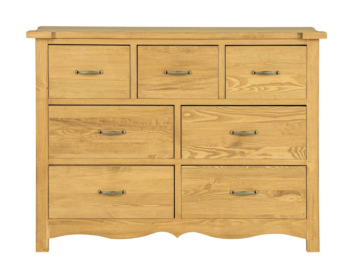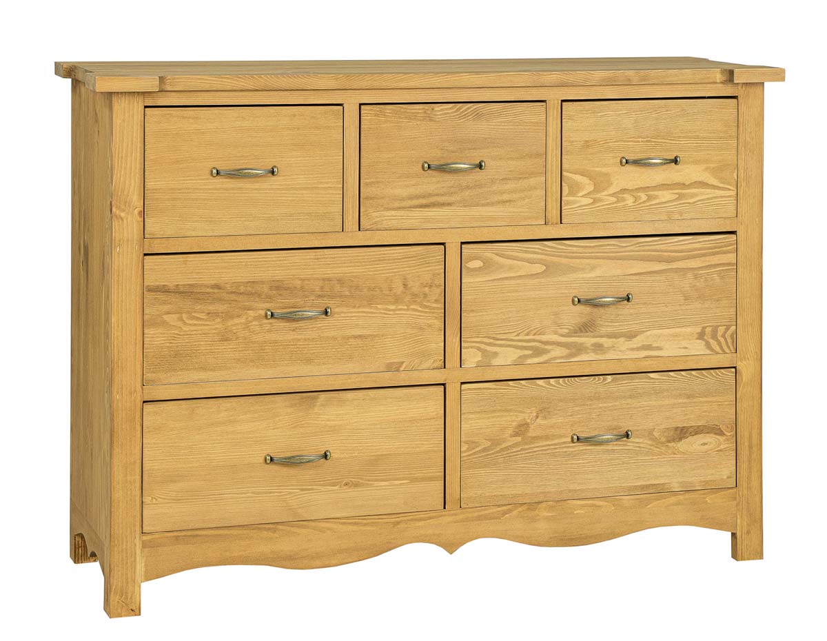 Komoda woskowana KD716 zaprojektowana w stylu rustykalnym, wykonana w całości z litego drewna sosnowego. Posiada trzy szufladki bezpośrednio pod blatem oraz poniżej cztery większe i pojemne szuflady. Doskonale sprawdzi się w salonie, sypialni, czy garderobie jako bieliźniarka. Nada każdemu wnętrzu niepowtarzalny klimat, pełen ciepła i rodzinnej atmosfery. Dzięki jej funkcjonalności przechowywanie stanie się o wiele prostsze. Komoda posiada trwałą i solidną konstrukcję. Minimalistyczna, prosta i elegancka komoda.