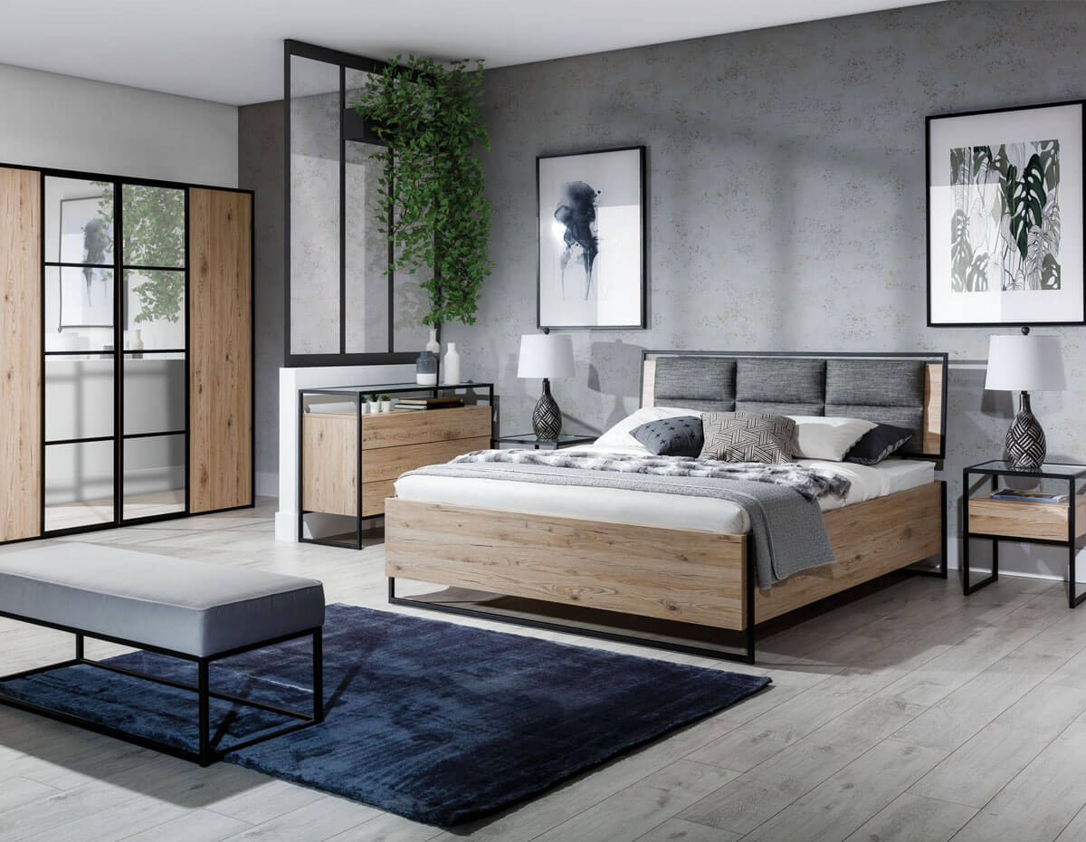 Zestaw GlassLoft powstał z połączenie płyty meblowej, imitującej postarzane drewno dębowe z czarnym metalem i szkłem. Metalowe elementy: ramka w kształcie prostokątów na lustrze, nogi łóżka, stolików nocnych, toaletki i komody oraz obrzeże wezgłowia pięknie komponują się ze szklanymi półkami.