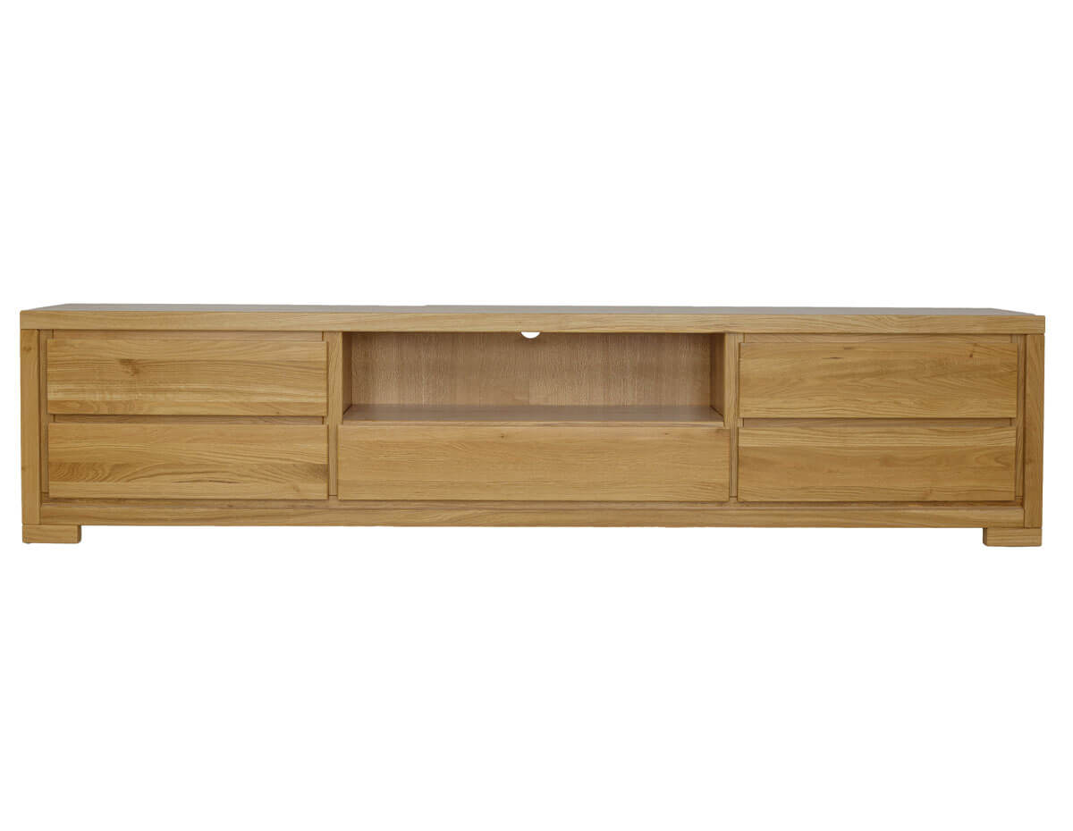 Dębowa szafka RV352 to mebel zaprojektowany w nowoczesnym stylu, który powstał z myślą o organizacji funkcjonalnego salonu. Posiada trzy otwarte półki, na których ustawisz sprzęt RTV. Poręczne, bezuchwytowe szuflady pomieszczą domowe drobiazgi.
