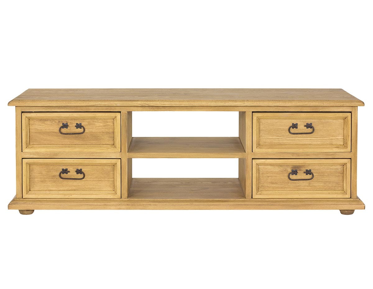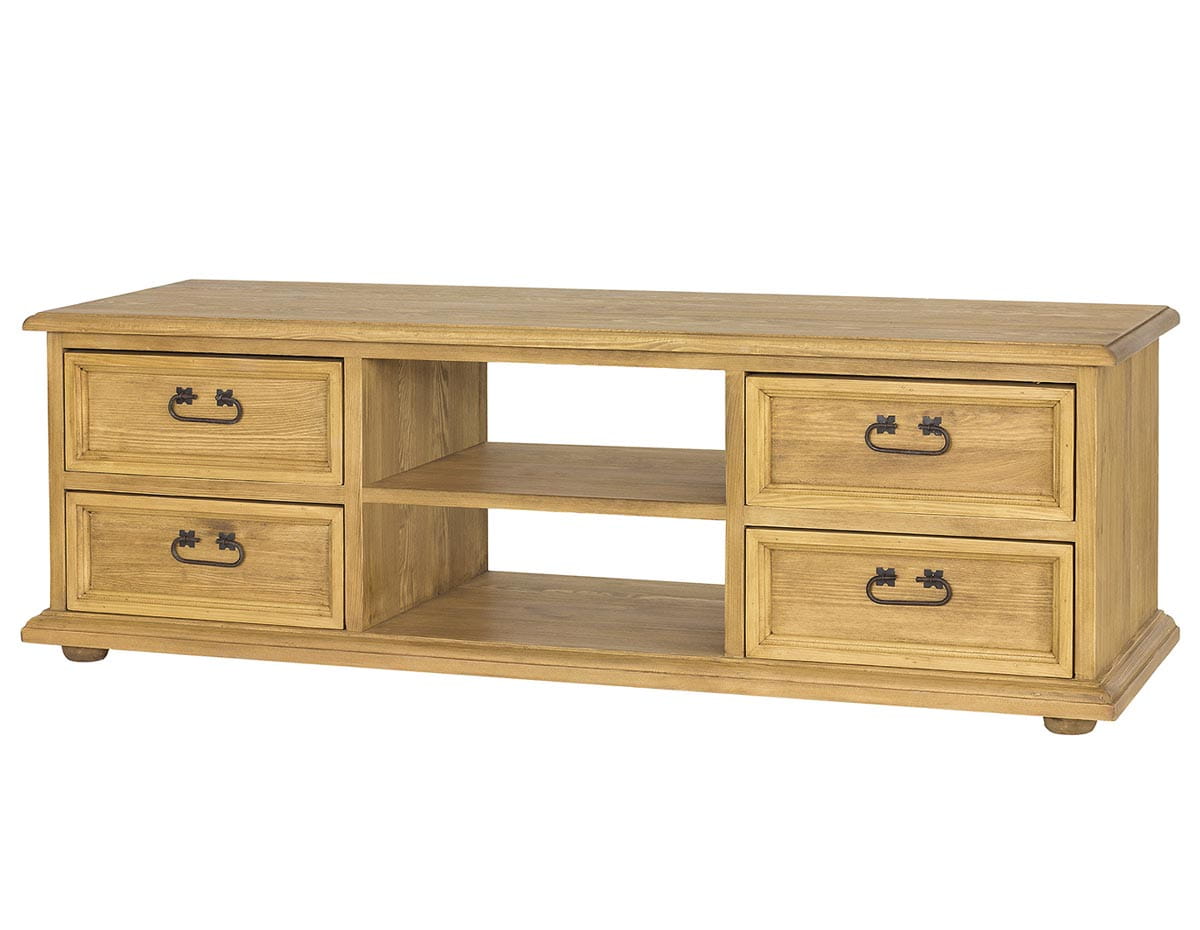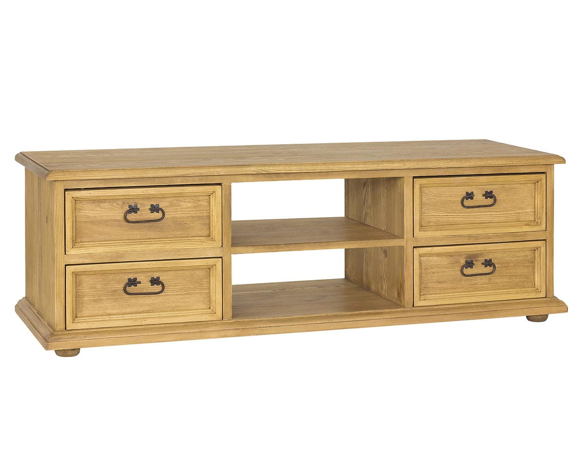 Woskowana szafka RTV pod telewizor RV702 zaprojektowana w stylu rustykalnym, wykonana w całości z litego drewna sosnowego. Osadzona na drewnianych nóżkach w formie kul. Szafka posiada cztery szuflady, wysuwane na drewnianych prowadnicach (dwie po prawej i dwie po lewej stronie). Po środku znajduje się wnęka z przeznaczeniem na sprzęt rtv. Fronty szuflad oraz spód szafki zostały ozdobione frezami. Mebel posiada trwałą i solidną konstrukcję. Do produkcji zostały wykorzystane ręcznie wykonywane metalowe uchwyty z efektem postarzenia. Szafka RV702 nada każdemu wnętrzu niepowtarzalny klimat, pełen ciepła i rodzinnej atmosfery.