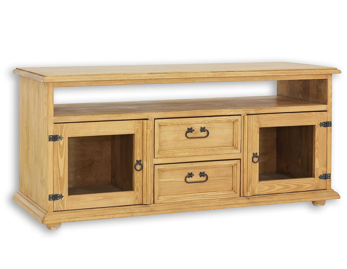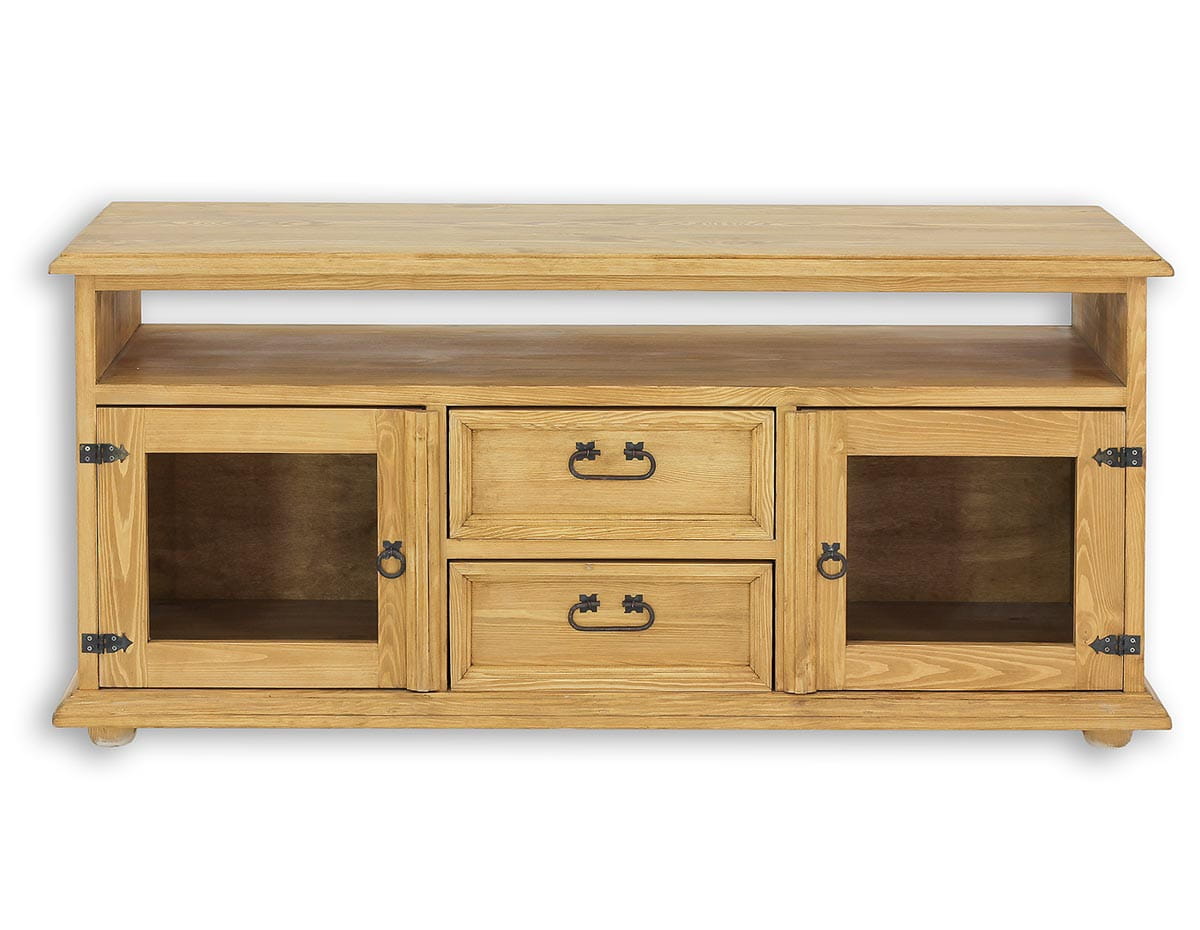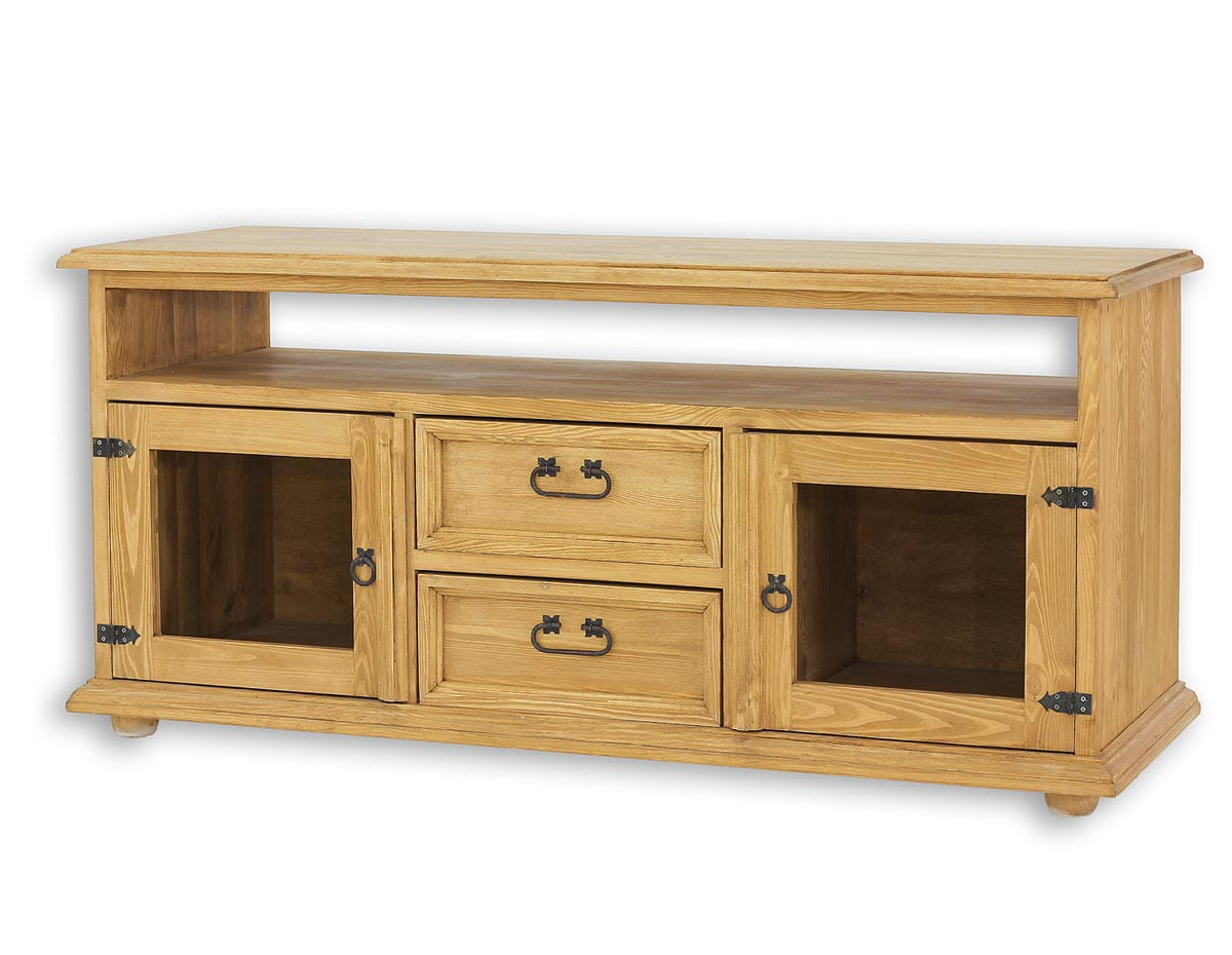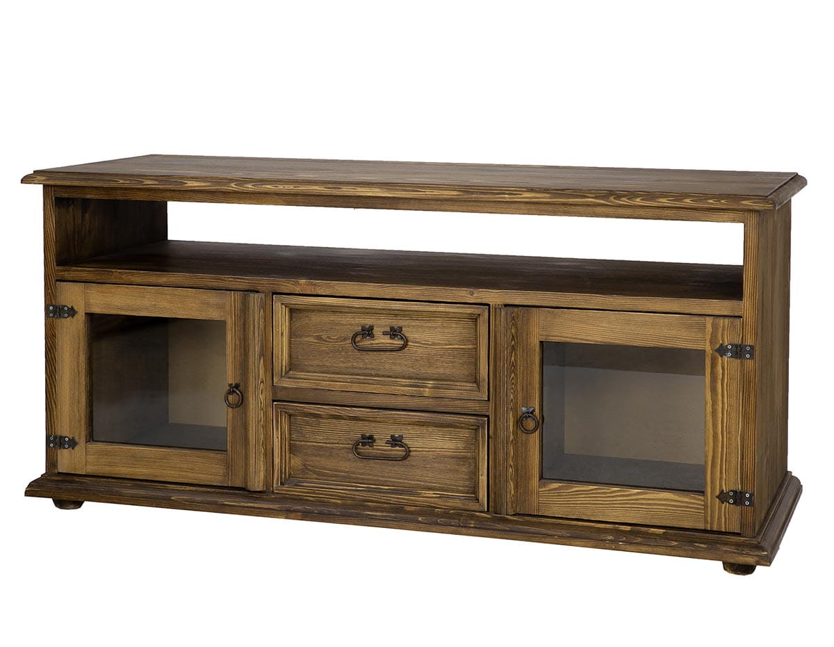Woskowana szafka RTV pod telewizor RV706 zaprojektowana w stylu rustykalnym, wykonana w całości z litego drewna sosnowego. Osadzona na drewnianych nóżkach w formie kul. Drewniany mebel składa się z trzech segmentów – dwie boczne półki, z pojedynczymi, przeszklonymi drzwiczkami rozdzielają szuflady na drewnianych prowadnicach. Oprócz tego, bezpośrednio pod blatem umieściliśmy praktyczną wnękę na sprzęt rtv. Mebel posiada trwałą i solidną konstrukcję. Do produkcji zostały wykorzystane ręcznie wykonywane metalowe zawiasy i uchwyty z efektem postarzenia. Szafka RV706 nada każdemu wnętrzu niepowtarzalny klimat, pełen ciepła i rodzinnej atmosfery.