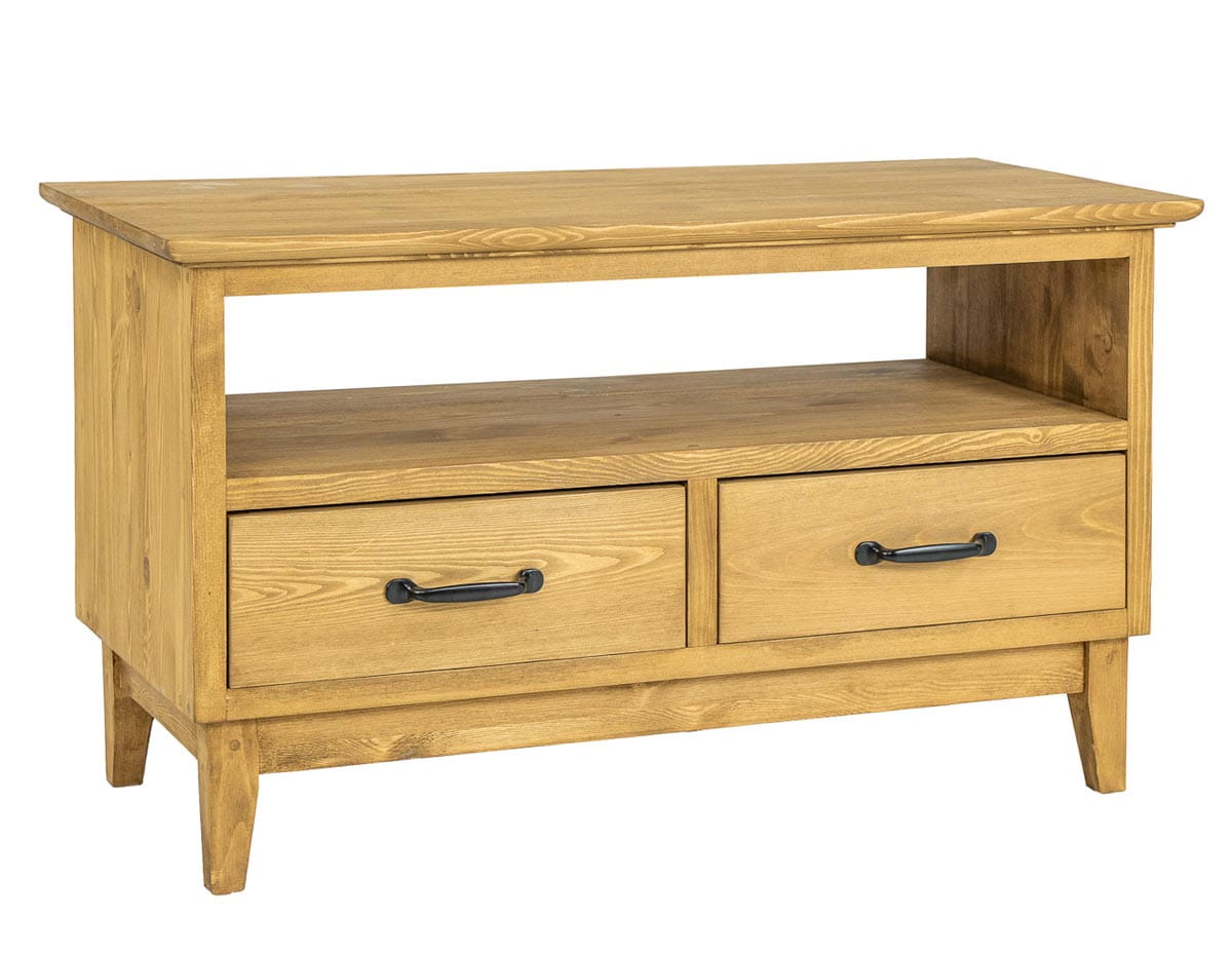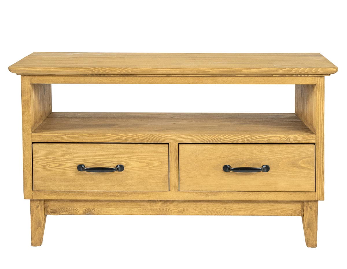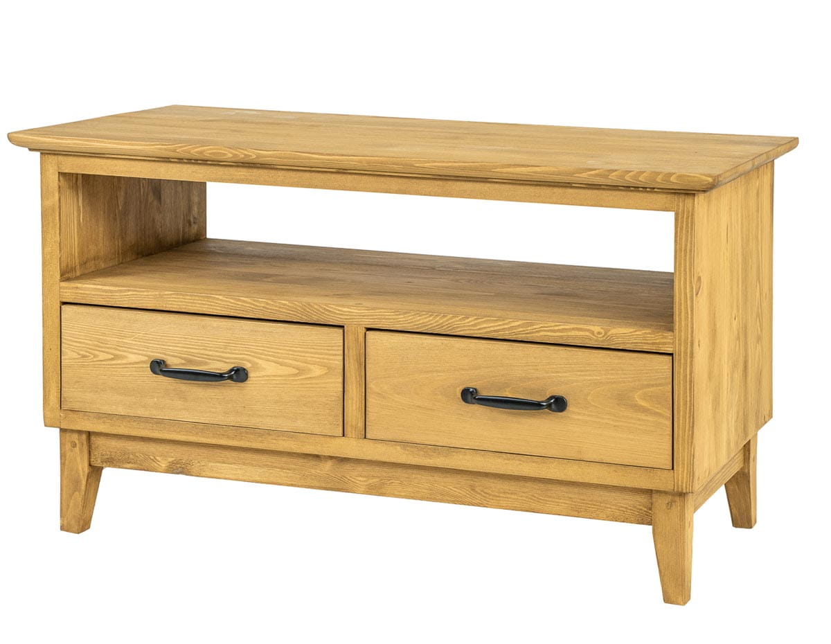 Woskowana szafka RTV pod telewizor RV707 zaprojektowana w stylu rustykalnym, wykonana w całości z litego drewna sosnowego. Szafka RTV sosnowa osadzona została na stożkowo ściętych nóżkach. Drewniany mebel posiada dwie wysuwane szufladki. Oprócz tego, bezpośrednio pod blatem znajduje się praktyczna wnęka na sprzęt rtv. Do produkcji wykorzystaliśmy ręcznie robione metalowe uchwyty. Szafka RV707 nada każdemu wnętrzu niepowtarzalny klimat, pełen ciepła i rodzinnej atmosfery.