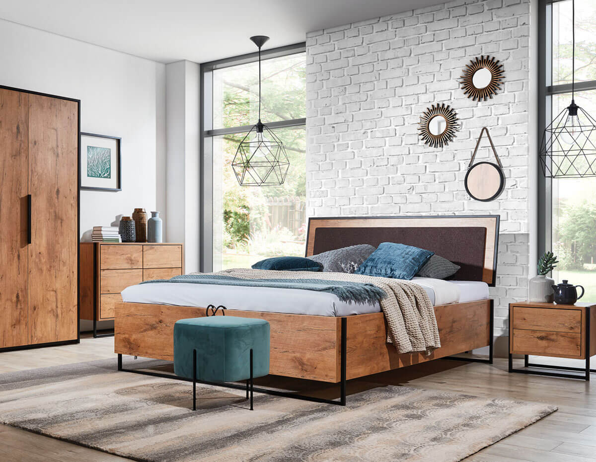 Zestaw Loft powstał z połączenie płyty meblowej, imitującej drewno dębowe z czarnym metalem. Metalowe elementy: ramka w kształcie prostokątów na lustrze, nogi łóżka, stolików nocnych, toaletki i komody oraz obrzeże wezgłowia.