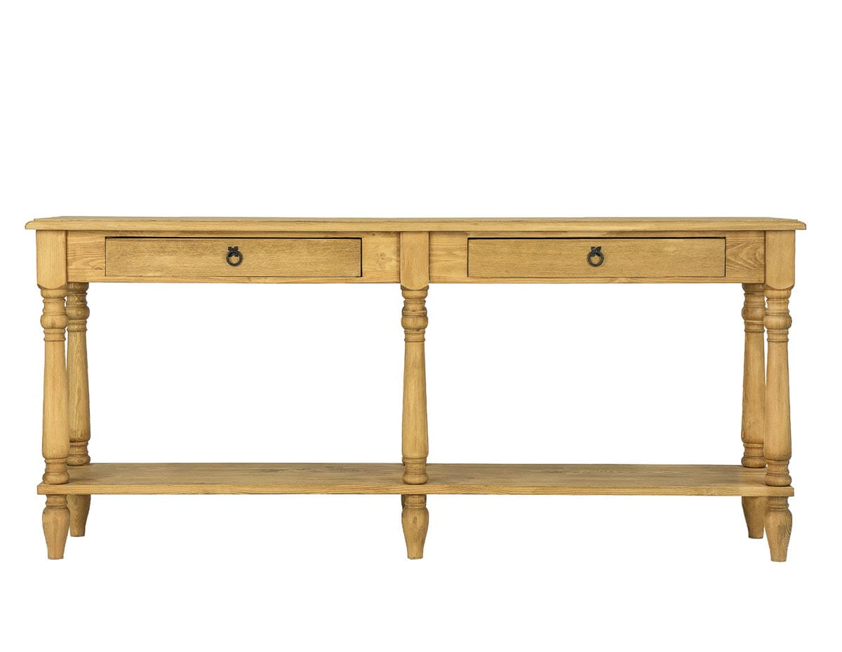Woskowana toaletka – podwójna konsola LT702. Zaprojektowana w stylu rustykalnym, wykonana w całości z litego drewna sosnowego. To niezbędny element każdego stylowo urządzonego wnętrza. Sprawdzi się zarówno w roli stolika np. w gabinecie, jak również jako sypialniana toaletka. Piękna konsola z szufladkami wsparta jest na czterech toczonych nogach, które zapewniają stabilizację oraz gwarantują, że mebel nie będzie się kołysać. Mebel jest bardzo praktyczny i stanowi piękną ozdobę całego wnętrza. Do produkcji zostały wykorzystane ręcznie wykonywane metalowe zawiasy i uchwyty z efektem postarzenia. Widoczne usłojenia podkreślają piękno naturalnego drewna. LT702 nada każdemu wnętrzu niepowtarzalny klimat, pełen ciepła i rodzinnej atmosfery.
