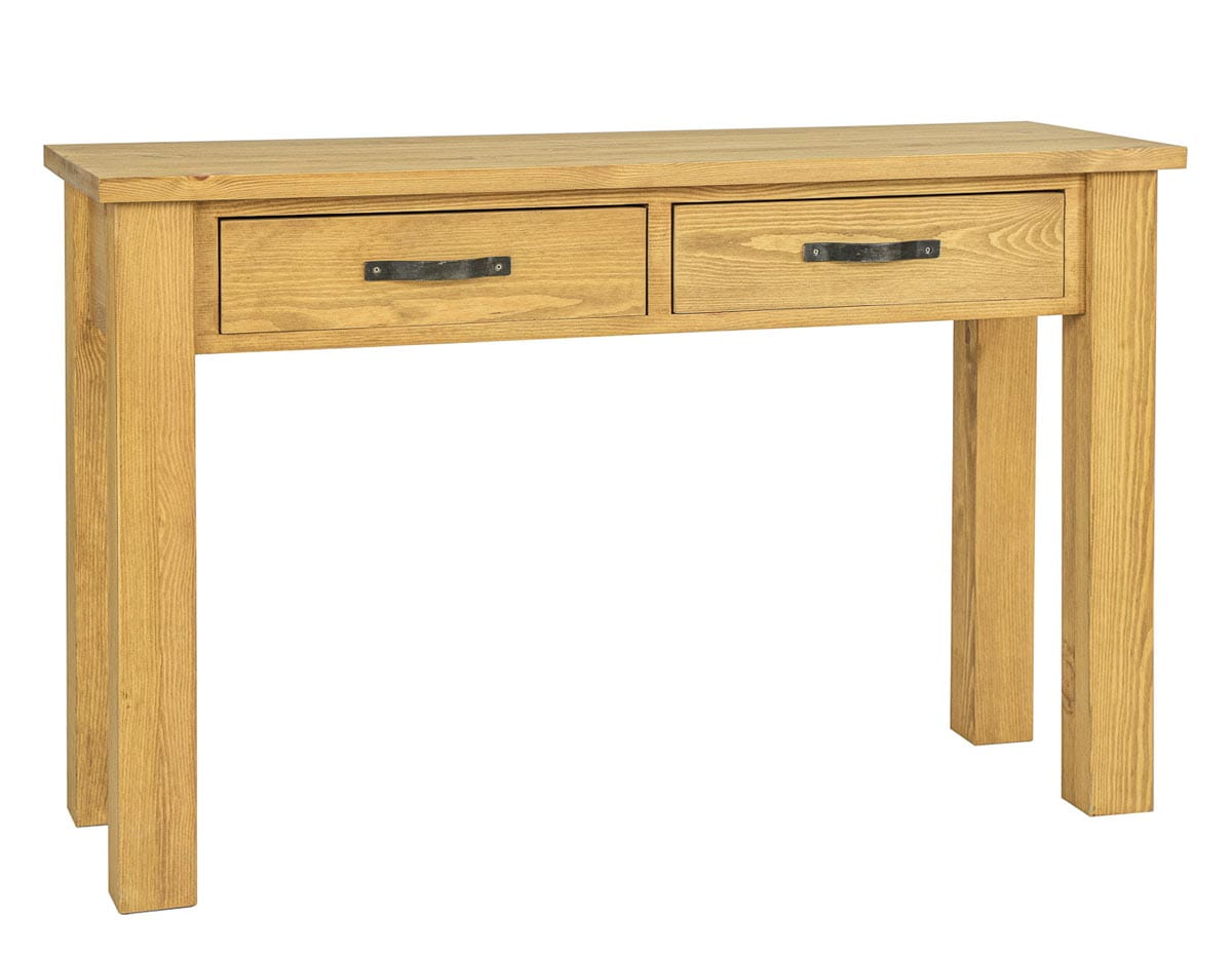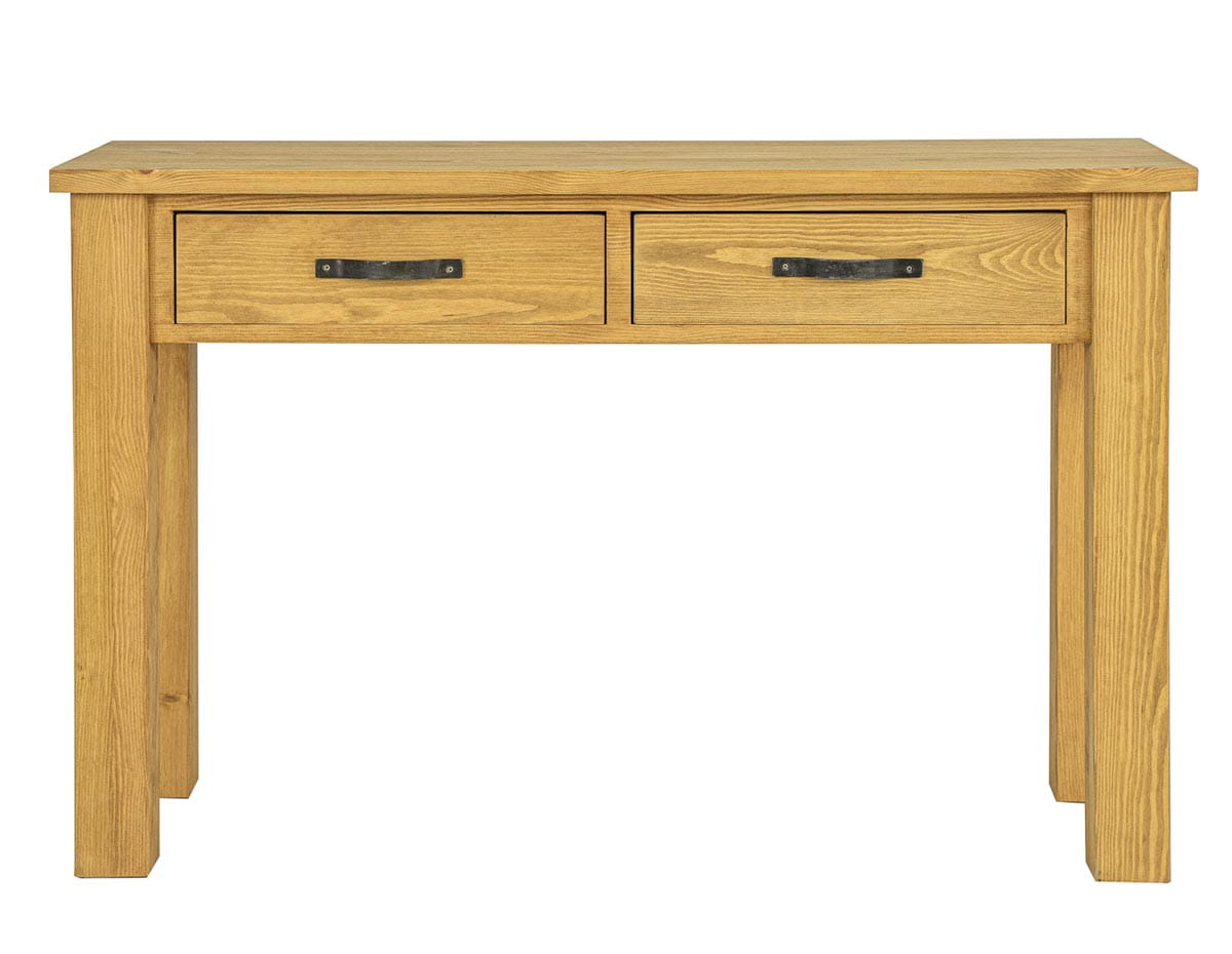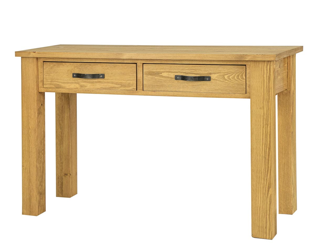 Woskowana toaletka – konsola LT705. Zaprojektowana w stylu rustykalnym, wykonana w całości z litego drewna sosnowego. Toaletka w stylu rustykalnym posiada solidną i masywną konstrukcję, która nawiązuje do dawnej, wiejskiej estetyki. Niezależnie od stylu, konsola powinna być funkcjonalna. Dlatego wyposażona jest w dwie praktyczne szufladki wysuwane po drewnianych prowadnicach. Toaletki drewniane i konsole to praktyczne meble z litego drewna, które choć podobne, mają nieco inne przeznaczenie. Konsola drewniana jest meblem, który możemy wykorzystać w przedpokoju, jako podręczny stolik. Sprawdzi się ona również w salonie, gdzie możemy ją wykorzystać do eksponowania dekoracji. Do produkcji zostały wykorzystane ręcznie wykonywane metalowe okucia. Widoczne usłojenia podkreślają piękno naturalnego drewna. LT705 nada każdemu wnętrzu niepowtarzalny klimat, pełen ciepła i rodzinnej atmosfery.