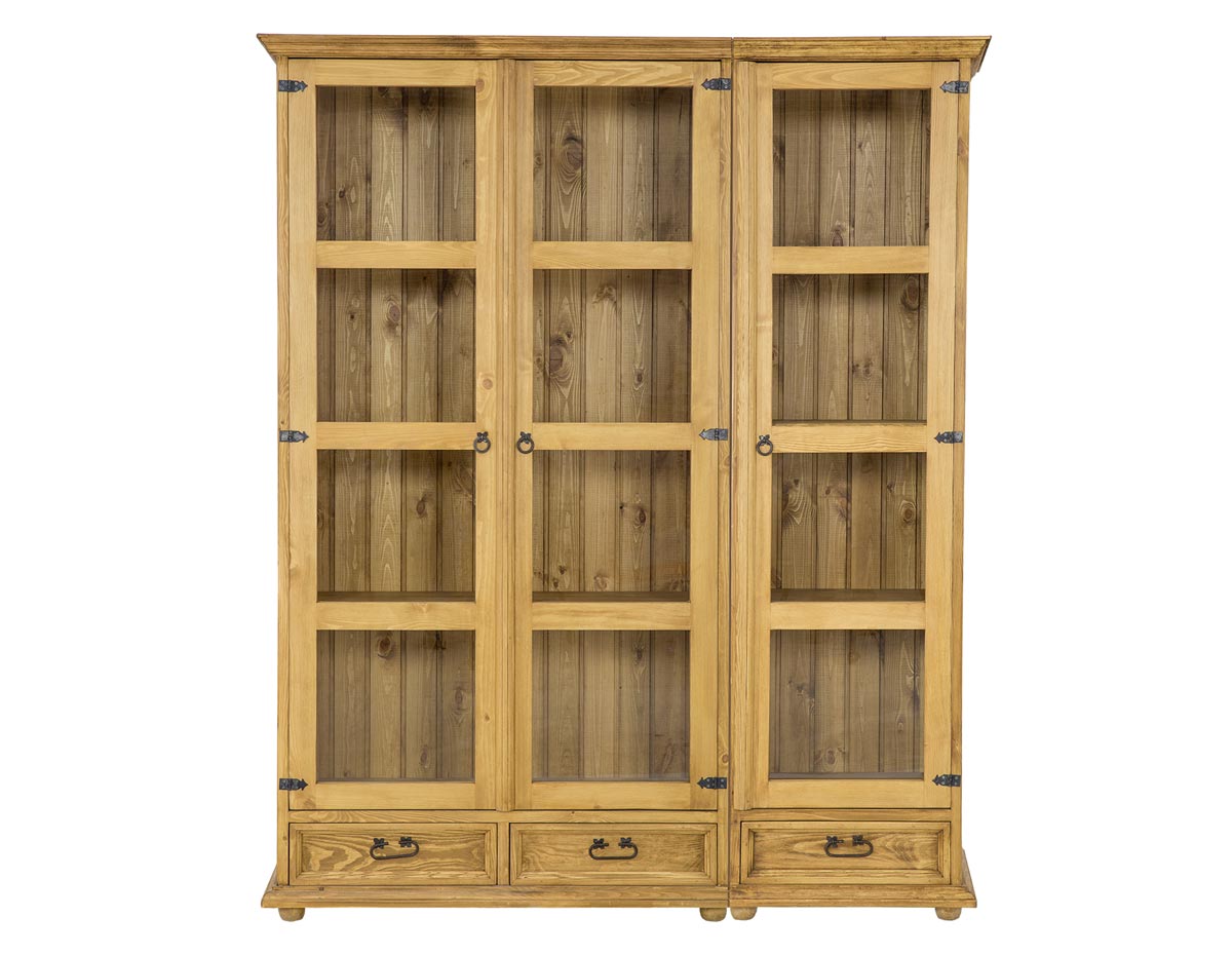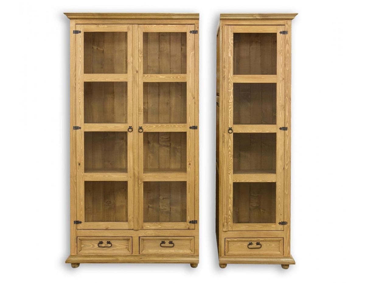 Trzydrzwiowa woskowana witryna KW709/II w wersji SLIM składa się z dwóch oddzielnych segmentów. Zmontowane części tworzą spójną całość. Model ten powstał z myślą o mniejszych mieszkaniach, gdzie wniesienie zmontowanej w całości, trzydrzwiowej witryny byłoby problematyczne. Witryny należy skręcić do siebie od środka przy pomocy załączonych śrub. W części dwudrzwiowej za przeszklonymi drzwiami znajdują się trzy półki i dwie pojemne szuflady. Część jednodrzwiowa posiada trzy półki i jedną szufladę. Szuflady wysuwają się na drewnianych prowadnicach. Witryna zaprojektowana została w stylu rustykalnym, wykonana w całości z litego drewna sosnowego. Znakomicie sprawdzi się do przechowywania zestawów obiadowych, ozdób, pamiątek lub książek. Mebel posiada trwałą i solidną konstrukcję. Do produkcji zostały wykorzystane ręcznie wykonywane metalowe uchwyty i zawiasy z efektem postarzenia. Witryna KW709/II nada każdemu wnętrzu niepowtarzalny klimat, pełen ciepła i rodzinnej atmosfery. Dzięki jej funkcjonalności przechowywanie stanie się o wiele prostsze.