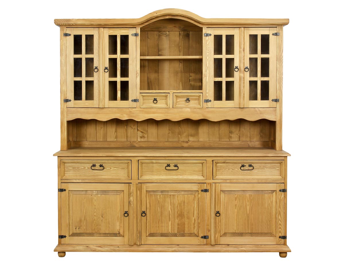 Woskowana witryna – kredens KW710 w wersji SLIM zaprojektowana w stylu rustykalnym, wykonana w całości z litego drewna sosnowego. Składa się z dwóch głównych elementów: komody i nadstawki. W środku trzydrzwiowej komody znajdziemy półkę umieszczoną na całej jej długości. Pod blatem znajdują się trzy szuflady wysuwane na drewnianych prowadnicach. Nadstawka składa się z dwóch oszklonych, podwójnych drzwiczek zewnętrznych (w środku każdej – dwie półki). Pomiędzy drzwiczkami znajduje się jedna półka oraz dwie małe szufladki. Górą nadstawka została wykończona wieńcem w kształcie półłuku, dołem zaś – pofalowaną listwą. Mebel posiada trwałą i solidną konstrukcję. Do produkcji zostały wykorzystane ręcznie wykonywane metalowe uchwyty i zawiasy z efektem postarzenia. Witryna – kredens nie musi kojarzyć się wyłącznie z kuchnią. Może stać się częścią dowolnego pomieszczenia. W salonie może spełniać funkcję barku, w jadalni posłuży do przechowywania sztućców i zastawy, w sypialni natomiast pomieści pościel i ręczniki. Witryna – kredens KW710 nada każdemu wnętrzu niepowtarzalny klimat, pełen ciepła i rodzinnej atmosfery. Dzięki jej funkcjonalności przechowywanie stanie się o wiele prostsze.