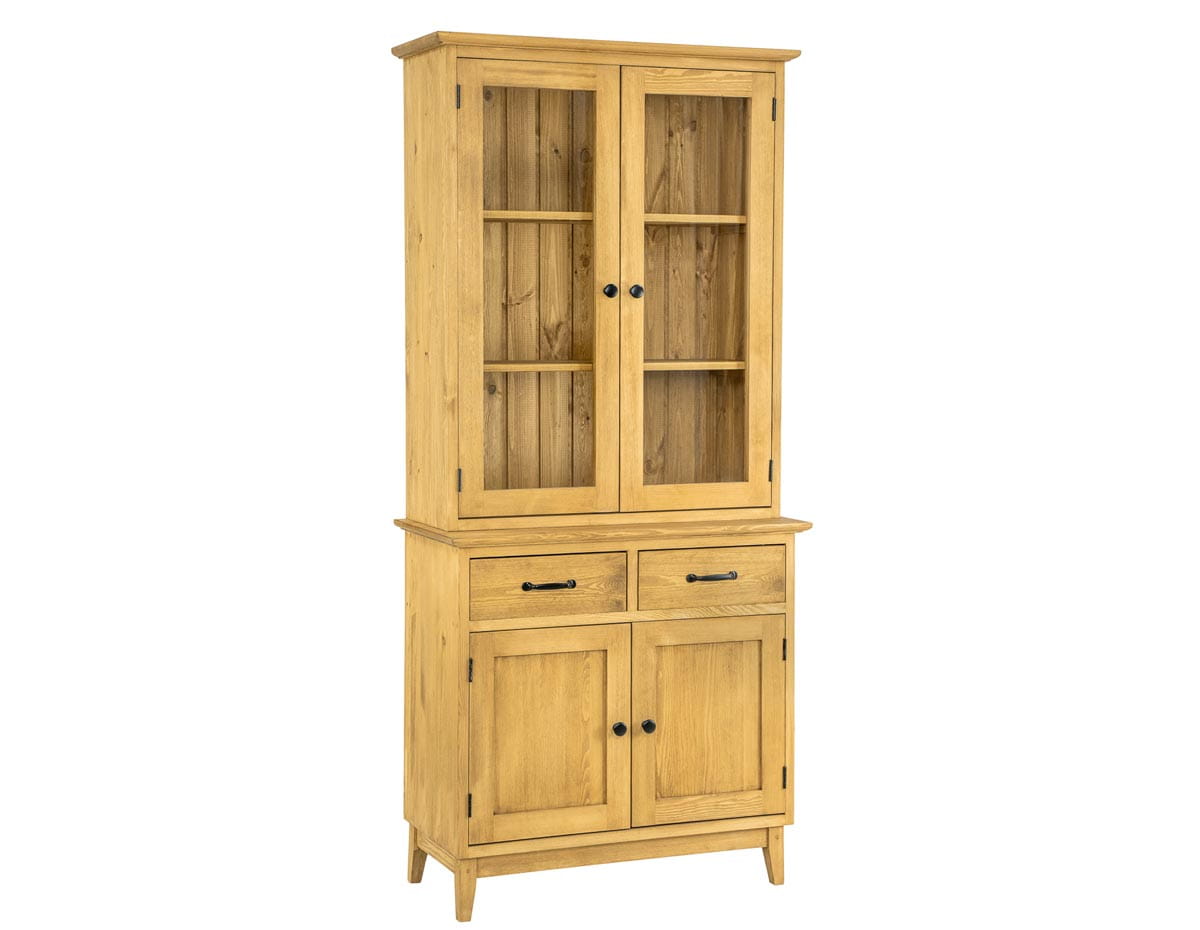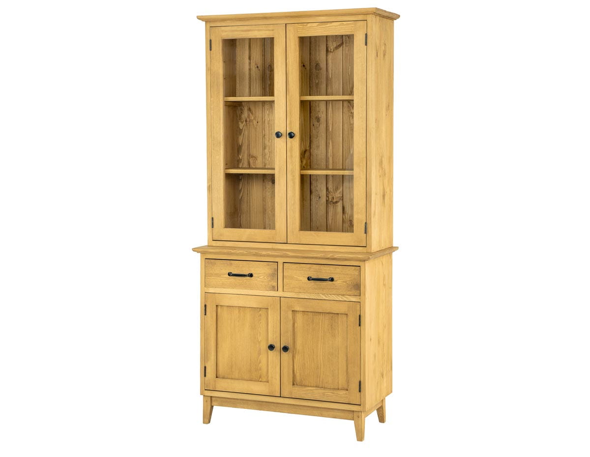 Podwójna, woskowana witryna KW721 zaprojektowana w stylu rustykalnym, wykonana w całości z litego drewna sosnowego. W górnej części witryny, za podwójnymi, przeszklonymi drzwiczkami znajdują się dwie półki, które znakomicie sprawdzą się do przechowywania zestawów obiadowych, ozdób, pamiątek lub książek. W środkowej części witryny umieszczone zostały dwie szufladki na drewnianych prowadnicach. W dolnej części znajduje się szafka, z podwójnymi drzwiczkami z półką w środku. Mebel posiada trwałą i solidną konstrukcję. Do produkcji zostały wykorzystane ręcznie wykonywane metalowe uchwyty i zawiasy z efektem postarzenia. Witryna KW721 nada każdemu wnętrzu niepowtarzalny klimat, pełen ciepła i rodzinnej atmosfery. Dzięki jej funkcjonalności przechowywanie stanie się o wiele prostsze.