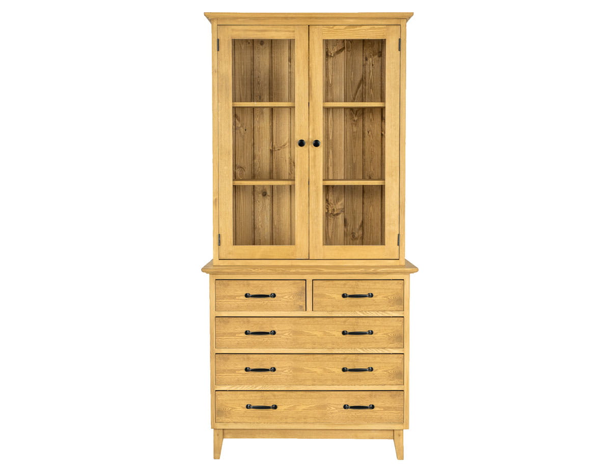 Podwójna, woskowana witryna KW722 zaprojektowana w stylu rustykalnym, wykonana w całości z litego drewna sosnowego. W górnej części witryny, za podwójnymi, przeszklonymi drzwiczkami znajdują się dwie półki, które znakomicie sprawdzą się do przechowywania zestawów obiadowych, ozdób, pamiątek lub książek. W środkowej części witryny umieszczone zostały dwie szufladki na drewnianych prowadnicach. W dolnej części znajdują się trzy, większe szuflady na całą szerokość witryny. Mebel posiada trwałą i solidną konstrukcję. Do produkcji zostały wykorzystane ręcznie wykonywane metalowe uchwyty i zawiasy z efektem postarzenia. Witryna KW722 nada każdemu wnętrzu niepowtarzalny klimat, pełen ciepła i rodzinnej atmosfery. Dzięki jej funkcjonalności przechowywanie stanie się o wiele prostsze.