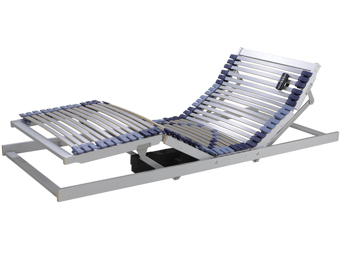Listwy gięte stelaża wykonane z drewna bukowego, klejonego warstwowo, pokrytego folią dekoracyjną w kolorze srebrnym. Listwy osadzone w potrójnych elastycznych uchwytach na ramie stelaża. Płynna regulacja elektryczna wysokości podgłówka i podnóżka. Siłownik zasilany bezpiecznym napięciem stałym 24V. Funkcja standby wprowadzająca układ zasilacza w stan czuwania, ograniczająca pobór energii elektrycznej, możliwość opuszczenia przy braku zasilania. Dodatkowa regulacja twardości w części środkowej stelaża.